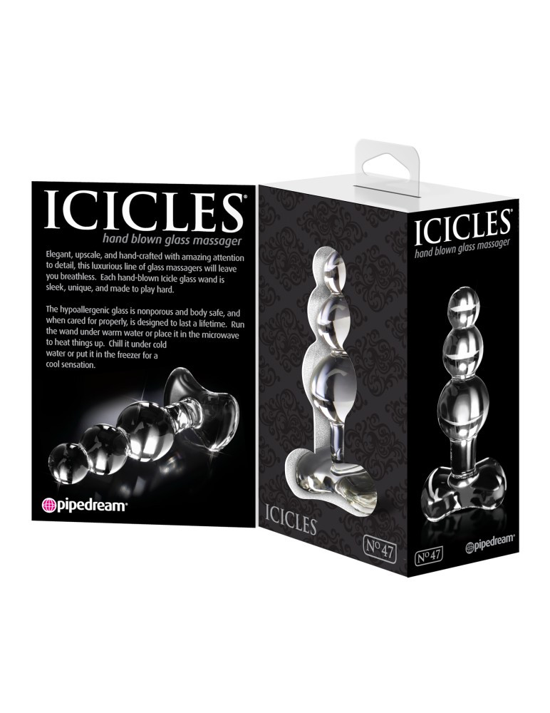 Elegáns kivitelű, egyedi kialakítású, hipoallergén bór-szilikát üvegből kézzel készített, 3 eltérő méretű gömbből álló, sima felületű fenékdugó, biztonságos alappal. Uniszex, férfiaknak és nőknek egyaránt ajánlott. A termék nem porózus, lehűthető és melegíthető is.Tisztítása : minden használat előtt és minden használat után langyos szappanos vízzel és segédeszköz tisztítóval kell lemosni. Víz- és szilikonbázisú síkosítóval is kompatibilis, ezek használata javasolt.
